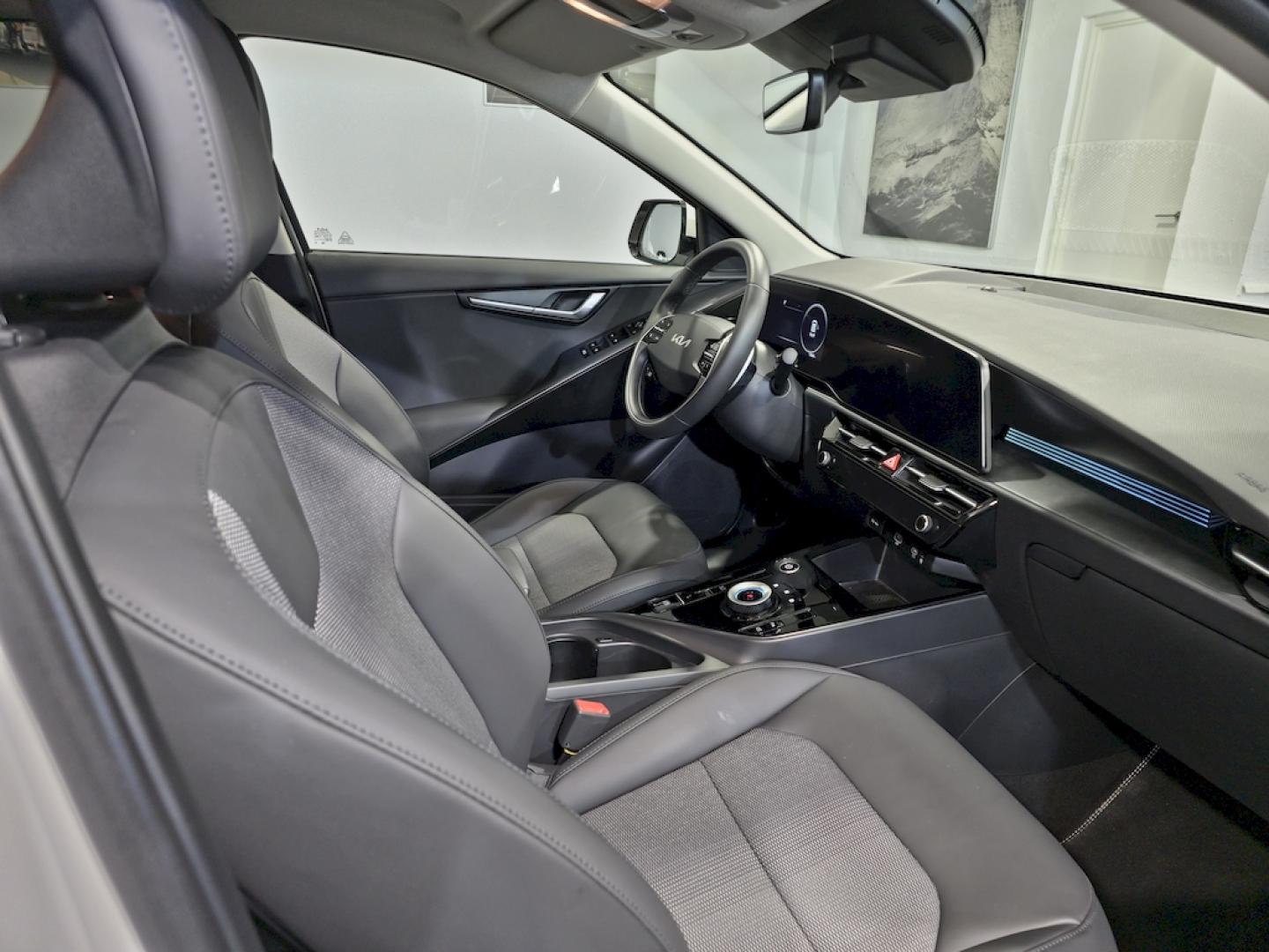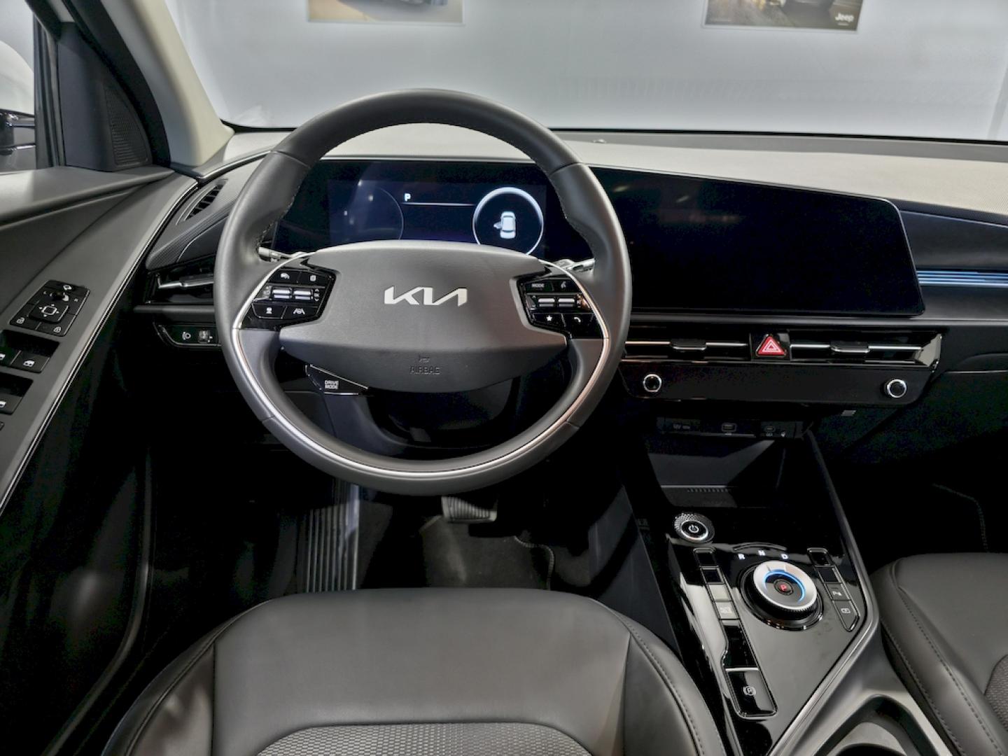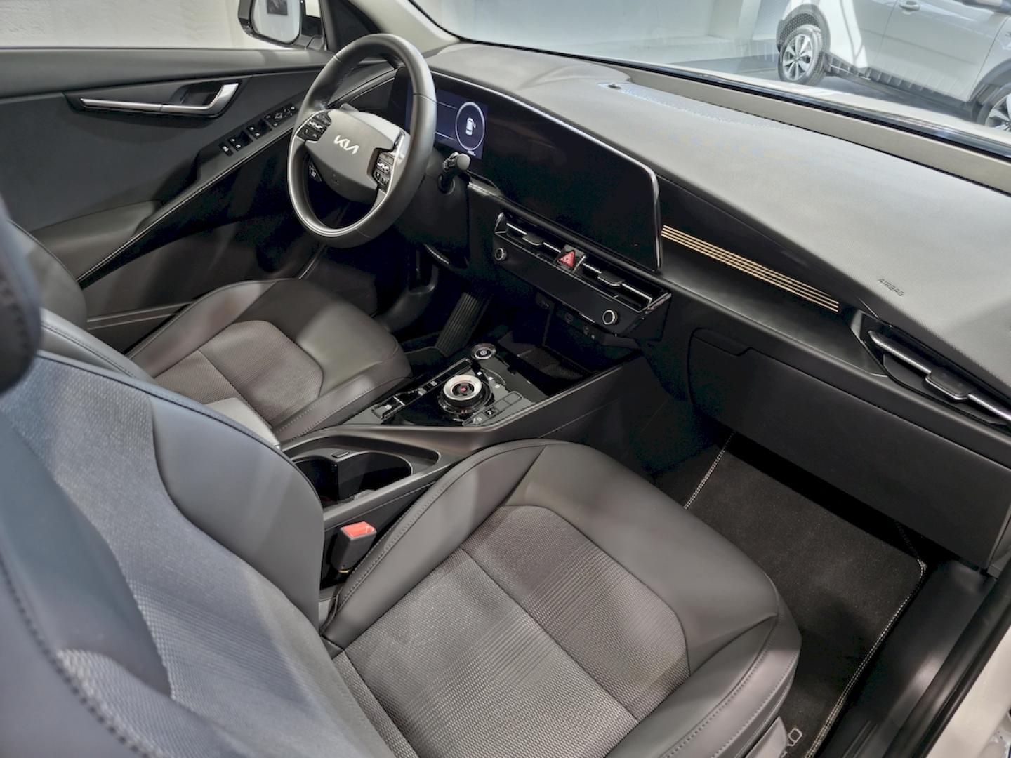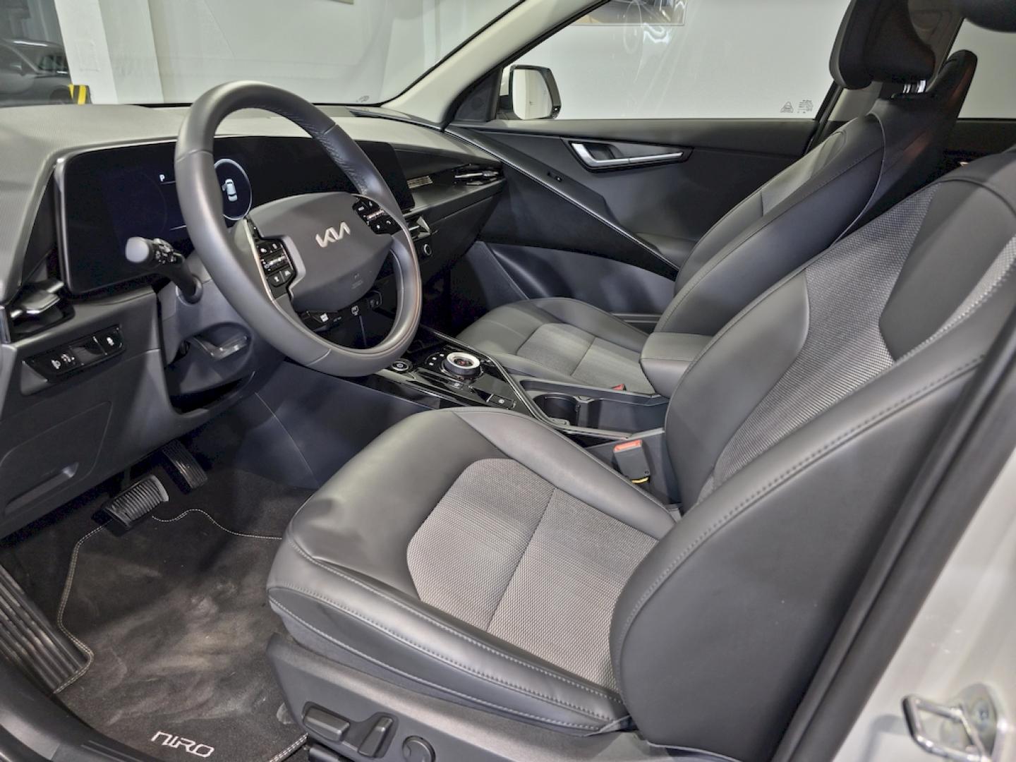 . - Confort: Asiento del conductor regulable eléctricamente con ajuste lumbar, Asiento del pasajero regulable en altura, Asistencia para seguimiento de carril con tráfico intenso, Cargador inalámbrico (teléfono móvil), Cargador USB en todas las filas, Climatizador Automático, Control de crucero adaptativo (con función Stop&Go), Precalentador de batería, Sensor de lluvia, Sensor de luces, Sensores de aparcamiento traseros, Sistema de botón de arranque electrónico + Llave inteligente - Exterior: Barras de techo, Combinación ópticas traseras con tecnología LED, Faros antiniebla delanteros con tecnología LED, Faros delanteros tipo LED, Lunas oscurecidas, Luz de circulación diurna con tecnología LED, Retrovisores exteriores plegables con el intermitente incorporado, Sensores de aparcamiento delanteros - Interior: Elevalunas eléctricos delanteros y traseros, Manecillas interiores cromadas, Navegador Kia Connect con cámara de asistencia al estacionamiento, Android Auto / Apple Carplay, y servicios de conectividad Kia -Pantalla de 26 cm (10,25''''), Panel de instrumentos integrado -pantalla TFT LCD 26 cm (10,25"), Red de maletero, Retrovisor interior electrocrómico, Tapicería mixta (tela + piel sintética) - Llantas y neumáticos: Kit de movilidad, Neumáticos 215/55 con llantas de aleación de 43cm (17") - Otros: Autonomía (460 km) - depende del modo de conducción, condiciones meteorológicas, climatización, batería.., Cargador trifásico a bordo + Cable de Recarga Tipo 2 Mennekes, El cable de carga eléctrica puede no coincidir con el definido en los folletos comerciales y/o la documentación del vehículo. La garantía del cable de carga la ofrece el fabricante del mismo., Sistema de carga bidireccional V2L (Vehicle to load) - Seguridad: 8 Airbags, ABS+MCB+ESC+HAC, Asistencia para seguimiento de carril, Asistente dinámico para luces de carretera, Sistema de asistencia de frenada de emergencia (colisión frontal) con reconocimiento de peatones, Sistema de asistente de prevención de colisión frontal en intersecciones, Sistema de control de presión de los neumáticos, Sistema de detección de ángulo muerto + Alerta de tráfico trasero + Asistente de salida segura del vehículo, Sistema de detección de fatiga del conductor, Sistema de llamada de emergencia (e-Call), Sistema reconocimiento límites de velocidad - Transmisión: Freno de estacionamiento eléctrico, Levas para modular la intensidad de frenada regenerativa en el volante, Selector de cambio giratorio